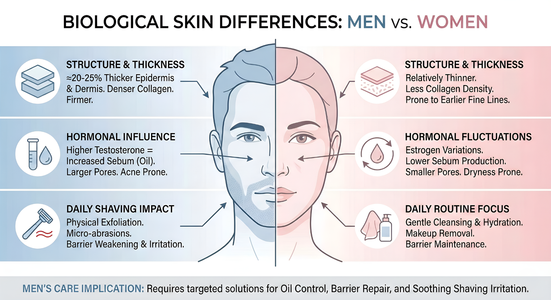 Thicker skin can slightly slow down absorption of products, but it isn’t the main reason men’s skincare sometimes feels ineffective. The real challenges come from higher testosterone levels, which drive increased sebum (oil) production, and the daily irritation caused by shaving. Oily skin, larger pores, and a higher propensity for blackheads and acne are typical results.