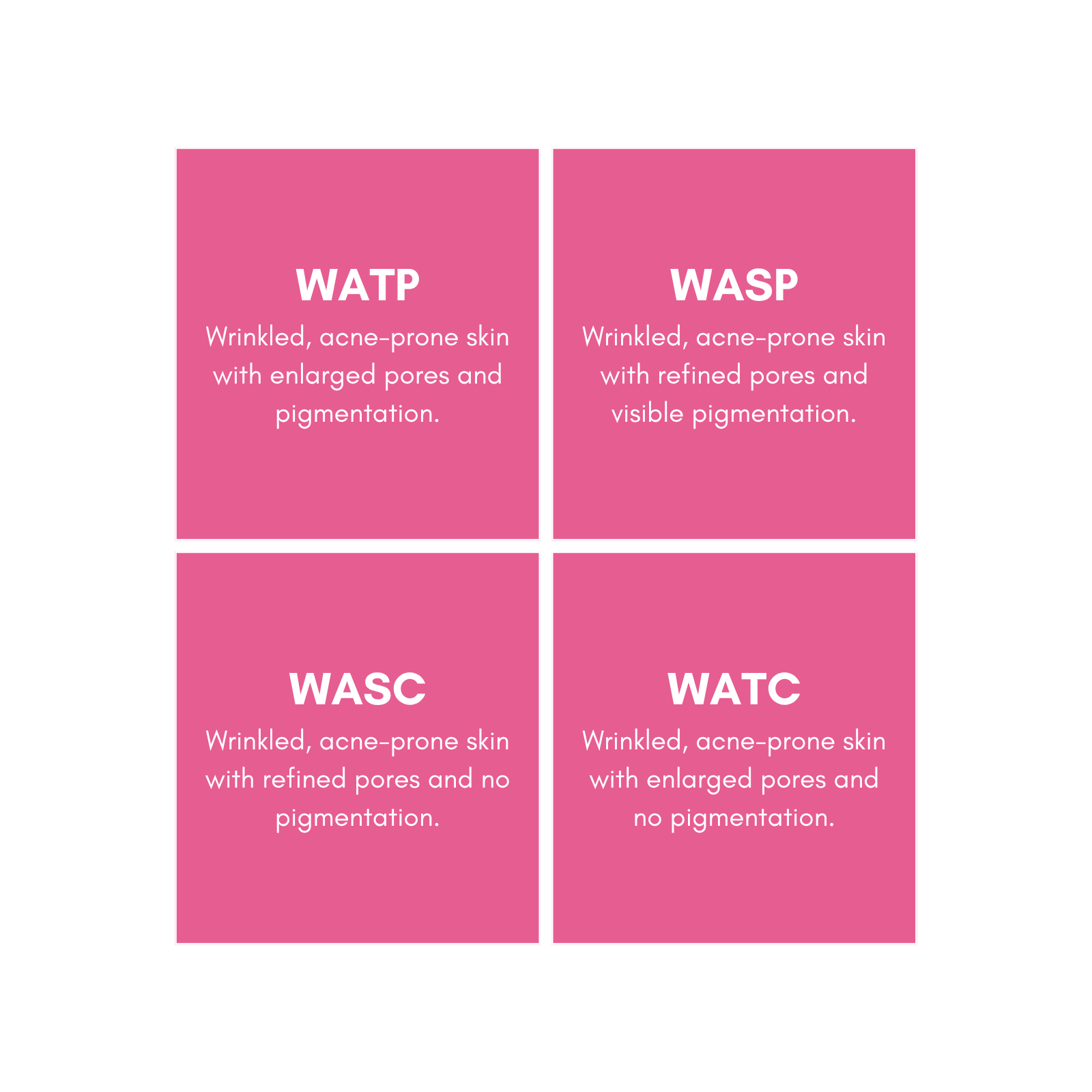 WASC: Wrinkled, acne-prone skin with refined pores and no pigmentation.