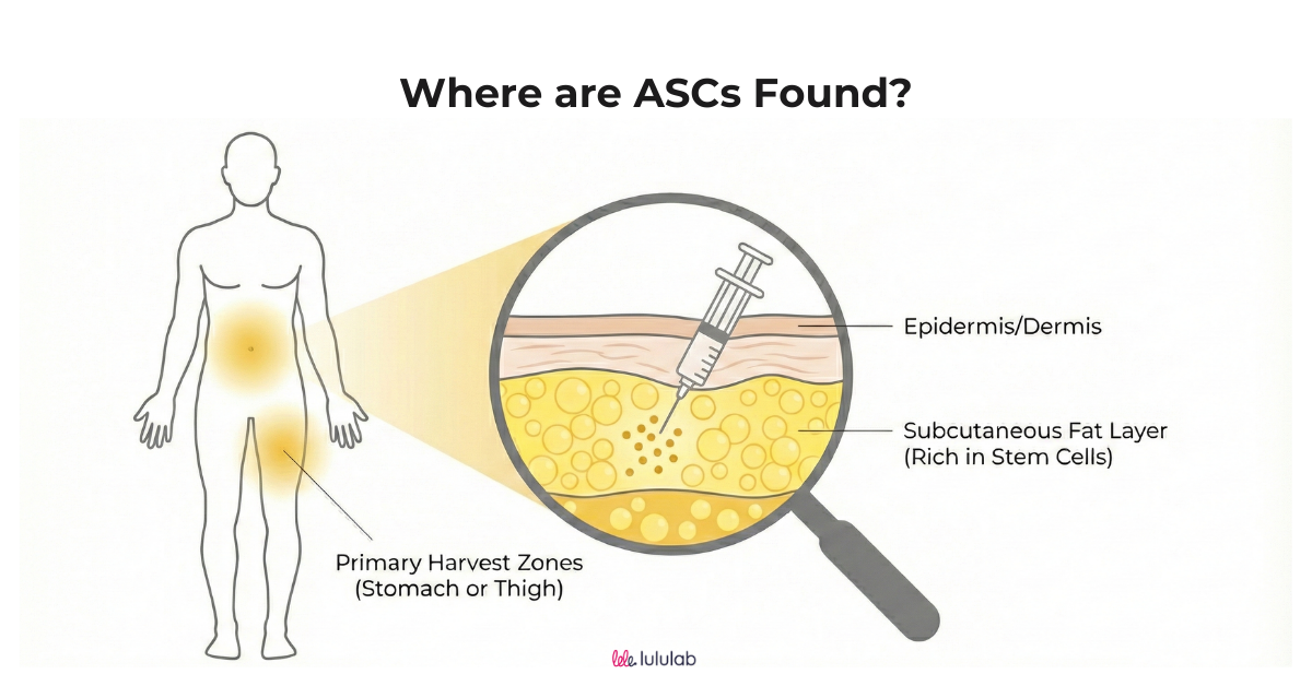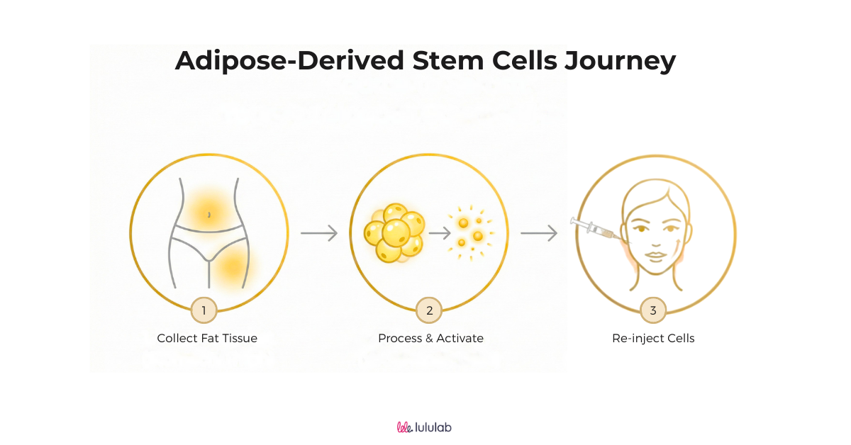 ASCs are rich in mesenchymal “repair cells” that support collagen regeneration and overall skin repair. During treatment, they are typically injected into the deep dermis or the subcutaneous layer beneath the skin. These layers are where they can most effectively restore volume, improve elasticity, refine texture, and support long-term skin regeneration.