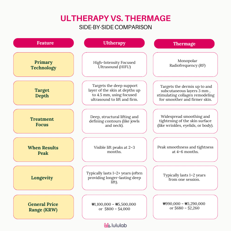 → Choose Thermage if your main concern is crepey skin, wrinkles, and you want overall tightening and smoothing of a large area or delicate skin (like around the eyes).